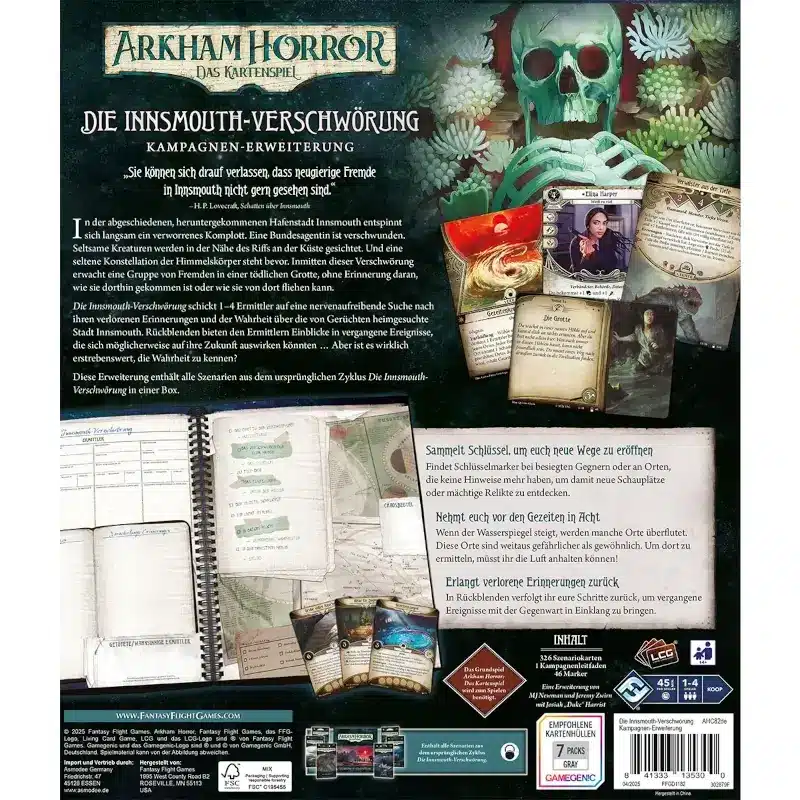 Diese Erweiterung ist ein atmosphärisches Meisterwerk: Die Innsmouth-Verschwörung erzählt eine verzweigte Kampagne mit düsteren Rückblenden und spannenden Wendungen. Für Fans des Arkham Horror Kartenspiels absolut empfehlenswert.