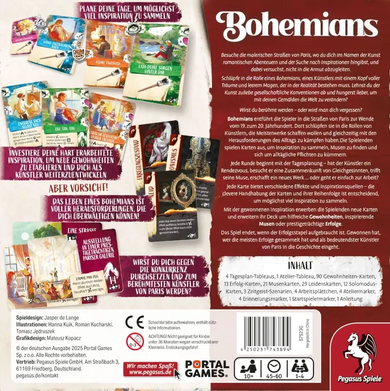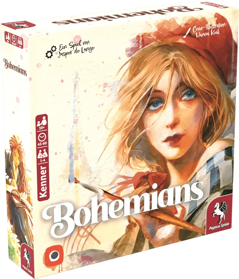 In dem Kennerspiel BOHEMIANS von Portal Games werdet ihr zu Künstler*innen und taucht ein in das Paris zur Wende vom 19. zum 20. Jahrhundert. Gestaltet geschickt euren Tag mit verschiedenen Aktivitäten, geht arbeiten und lasst euch von euren Musen inspirieren. Indem ihr eure Gewohnheits-Karten clever auf eurem Tagesplan-Tableau aneinanderlegt, könnt ihr Symbole vervollständigen und wertvolle Inspirationspunkte erhalten. Mithilfe der Inspiration könnt ihr euer Deck mit weiteren Karten verbessern, sowie Erfolgskarten erwerben. Das Spiel endet, wenn eine Person seine*ihre fünfte – oder mit vier Spielenden die vierte! – Erfolg-Karte erhält.