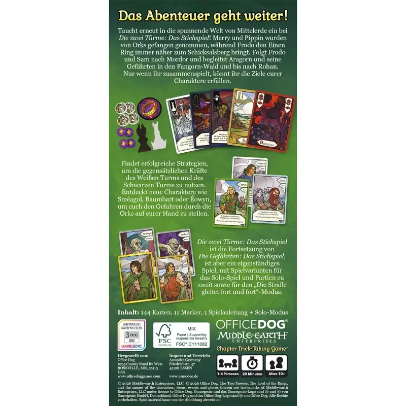Der Herr der Ringe: Die zwei Türme – Das Stichspiel ist ein kooperatives Kartenspiel für 1 bis 4 Personen, das euch in 18 Kapiteln durch den zweiten Teil von J. R. R. Tolkiens klassischer Roman-Trilogie Der Herr der Ringe begleitet.