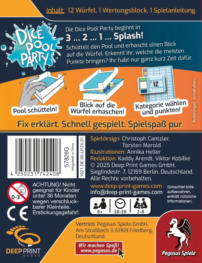 Die Dice Pool Party startet in 3 … 2 … 1 … Splash! Die Spielenden schütteln den Pool und müssen dann genau hinschauen und sich merken, was die Würfel zeigen. Aber Achtung: Dafür haben sie nur wenige Sekunden Zeit dafür! Dann wählen sie noch eine Kategorie, die ihnen viele Punkte bringt und ruckzuck können sie in einem Meer aus Punkten baden – doch Vorsicht: Jede*r kann jede Kategorie nur ein einziges Mal werten!