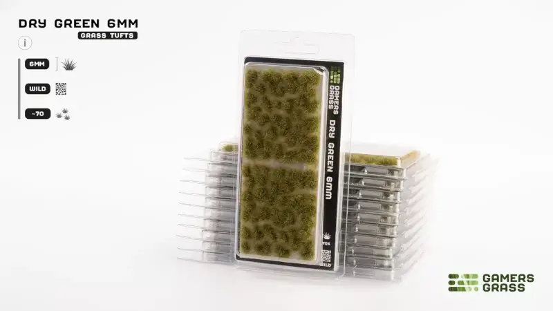 Dry Green 6 mm Wild ist ideal für natürliche Landschaften mit leicht ausgetrocknetem Gras. Die gedämpften Farbtöne wirken wie von Sonne und Wind gegerbt – perfekt für Bases zwischen Sommer und Herbst, ob Fantasy-Feld, Steppe oder verlassene Wiese.