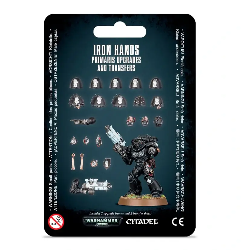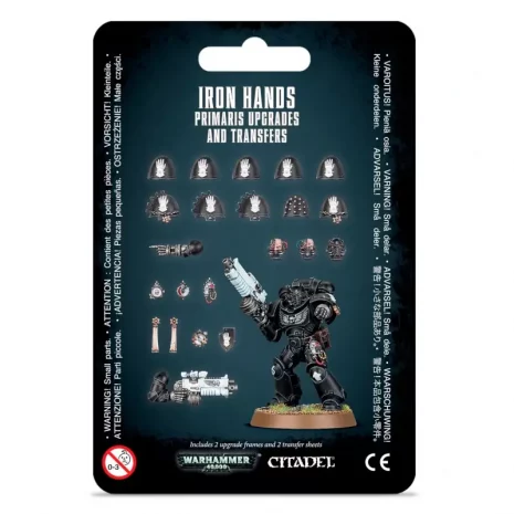 Ein Upgrade-Set für Primaris Space Marines mit markanten Iron Hands–Schulterplatten, Köpfen und Kapitelabziehbildern – perfekt für eisenharte Krieger.