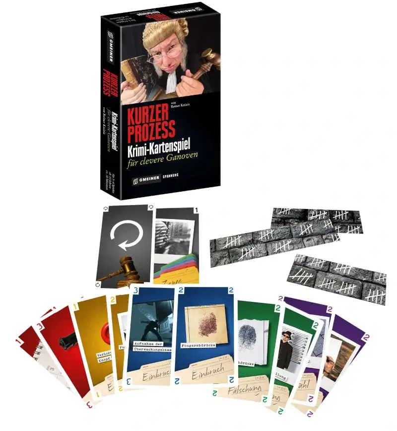Kurzer Prozess ist ein Krimi-Kartenspiel mit Verbrecher-, Zeugenkarten & Knastperioden. Für 3-6 Spieler, ab 10 Jahren, ca. 30 Minuten.