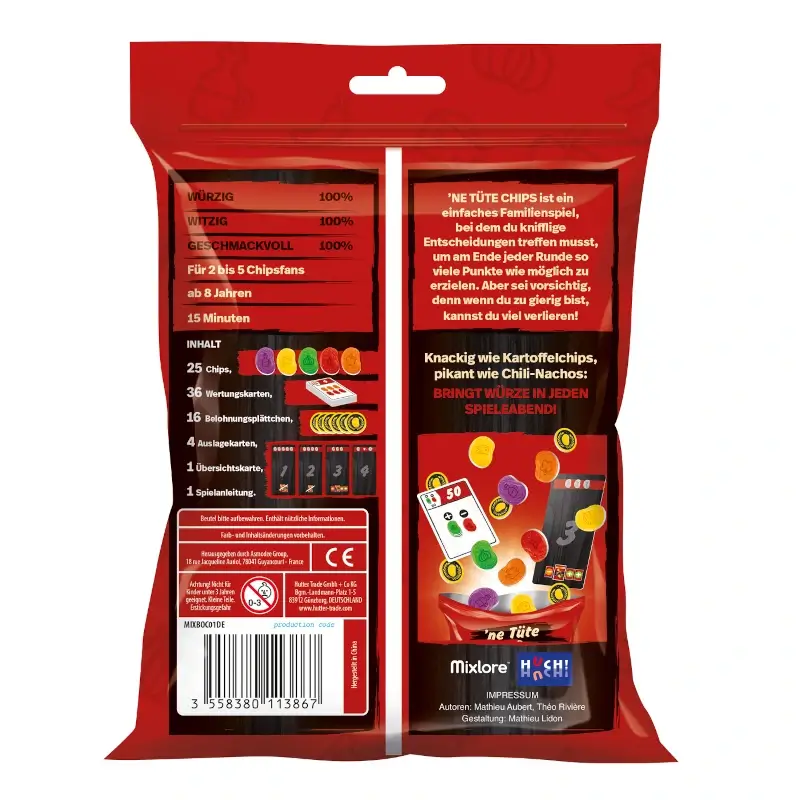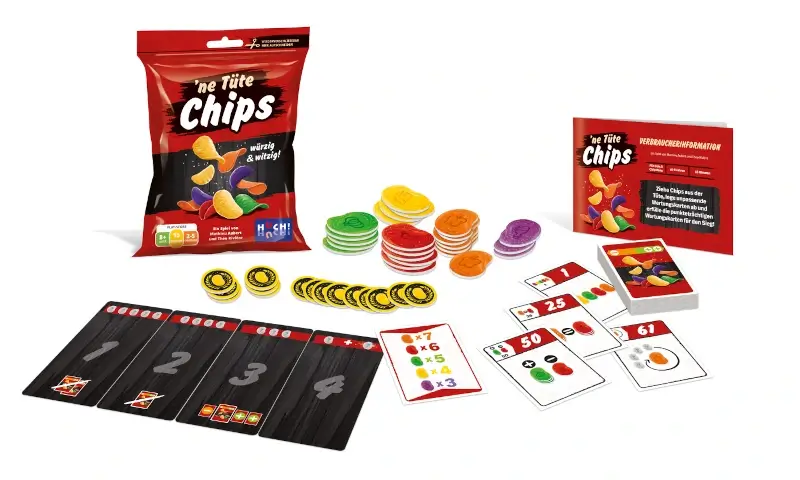 ´ne Tüte Chips ist ein einfaches und lockeres Familienspiel, bei dem ihr jede Runde in die Chips-Tüte greift und knifflige Entscheidungen treffen müsst, um so viele Punkte wie möglich zu bekommen.