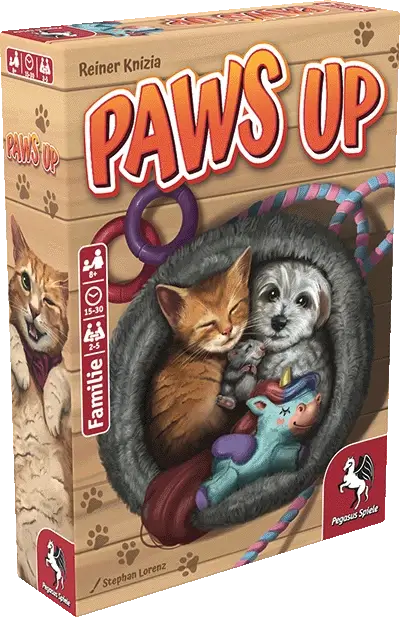 Im Kartenspiel Paws Up ertauschen sich die Spielenden Runde um Runde neue Tierfotos. Dazu spielen sie immer eine Handkarte aus und tauschen diese gegen eine der ausliegenden Karten ein. Die ausgespielte Handkarte mit dem höchsten Pfötchenwert beginnt die Tauschrunde und kann sich so die begehrteste Karte aus der Auslage sichern. Doch das muss nicht immer die Karte mit den meisten Pfötchen sein, denn auch Trends wollen mit hochkarätigen Story-Postings bedient werden. Wer hier am schnellsten eine angesagte Story aus drei passenden Tierfotos zusammenstellt, kann sich zusätzliche Pfötchen für die Punktewertung sichern. Wer nach 13 Runden die meisten Pfötchen über Handkarten und erstandene Storykarten für sich zählen kann, hat sich den Titel als neuer Social-Media-Star verdient.