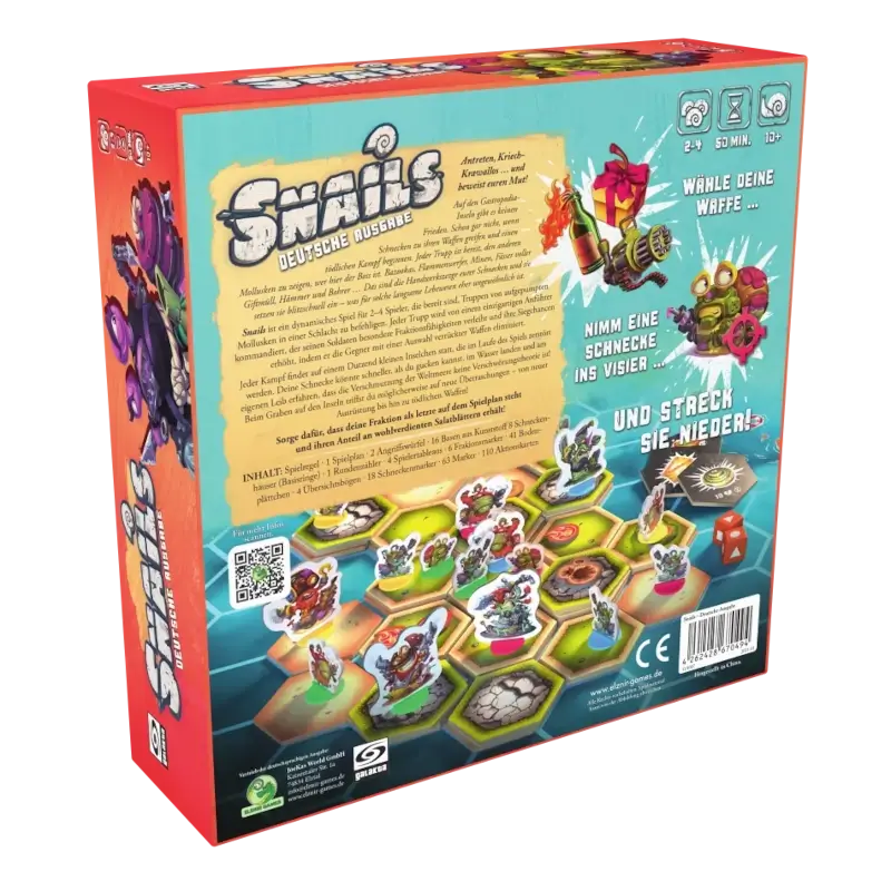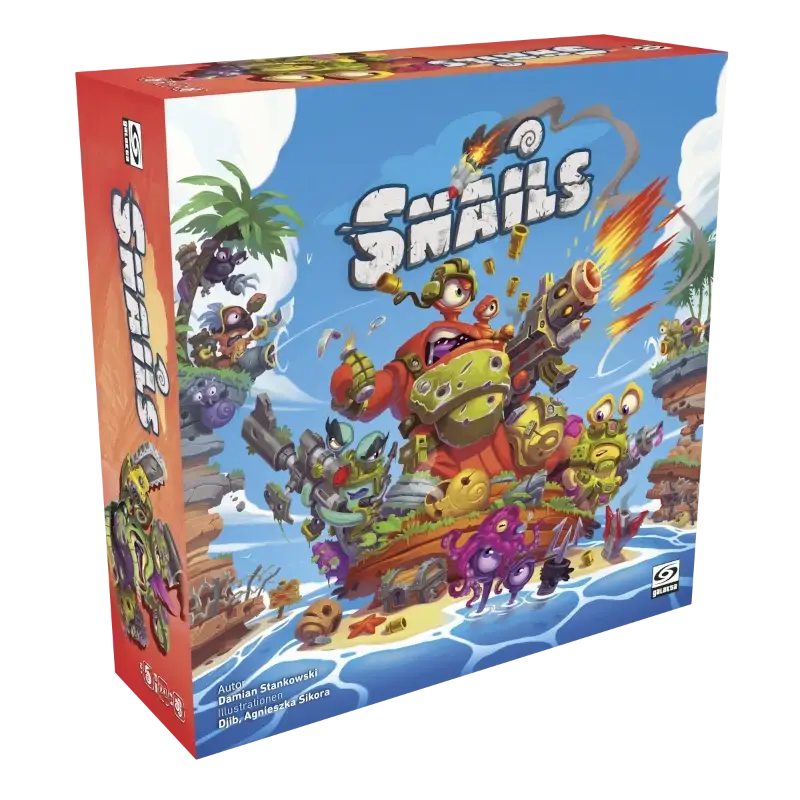 In Snails führst du bewaffnete Schneckensquads über Inseln, nutzt Aktionskarten & Heldenfähigkeiten und kämpfst taktisch. Für 2–4 Spieler, ab 10 Jahren, ca. 60 Minuten.