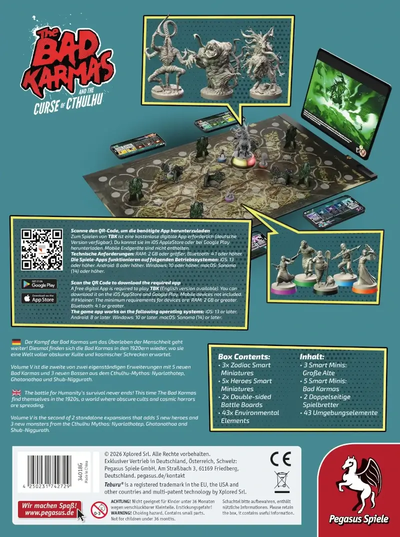 Volume 5 hebt die Bad Karmas-Serie auf mythologisches Niveau: Neben neuen Cthulhu-Helden kämpfen jetzt drei Zodiac-Bosse über zwei Spielbretter. Jede Partie mit App bleibt atmosphärisch dicht und taktisch anspruchsvoll.