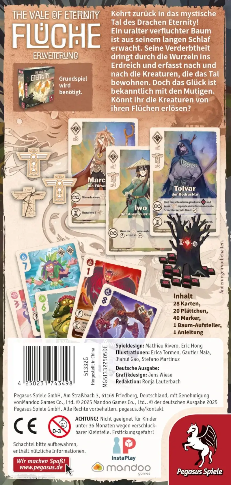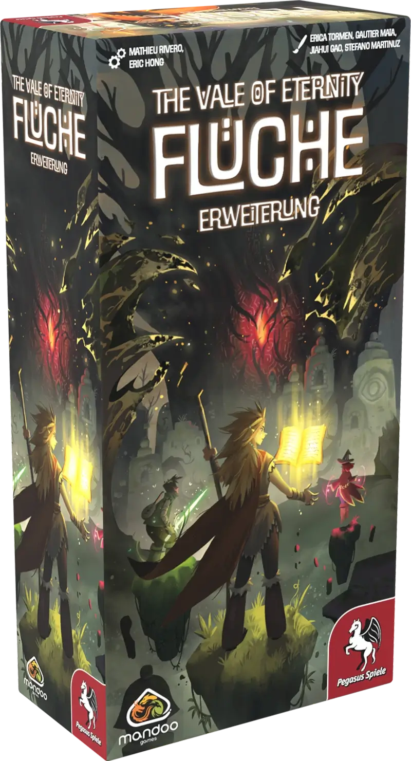 The Vale of Eternity: Flüche erweitert das Grundspiel um eine düstere, magische Dimension: Der uralte Fluchbaum ist erwacht und beeinflusst das Tal und seine Kreaturen. In jeder Runde können Spieler:innen Fluchkarten wählen, um Kreaturen zu beeinflussen – Fluch oder Erlösung? Wer die finstere Kraft meistert, kann mächtige Vorteile nutzen. Zusätzlich kommen Bändiger‑Plättchen ins Spiel, mit denen Kreaturen gezähmt oder verflucht werden können.