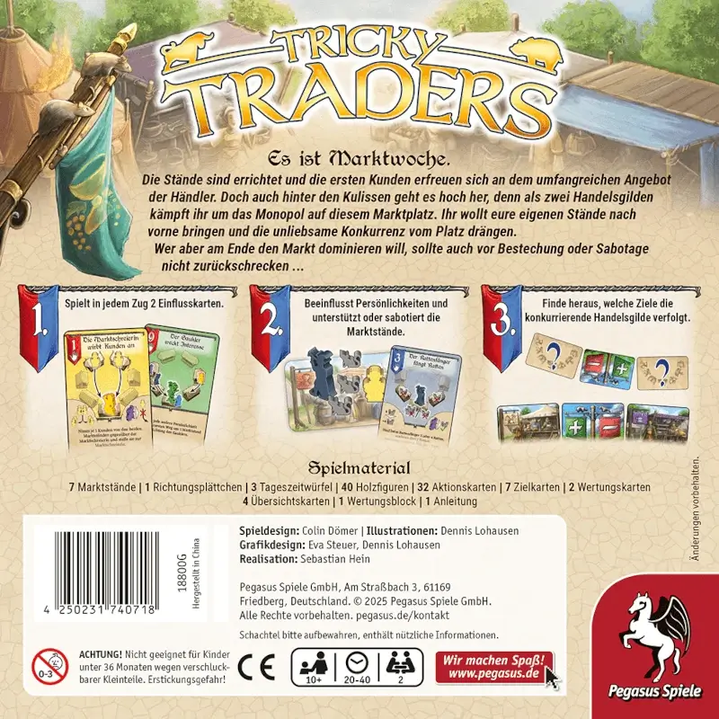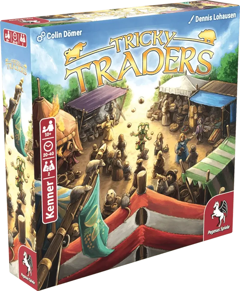 In Tricky Traders unterstützt ihr heimlich Marktstände, spielt Einflusskarten und sabotiert euren Gegner – ein taktisches Marktduell für 2 Spieler, ab 10 Jahren.